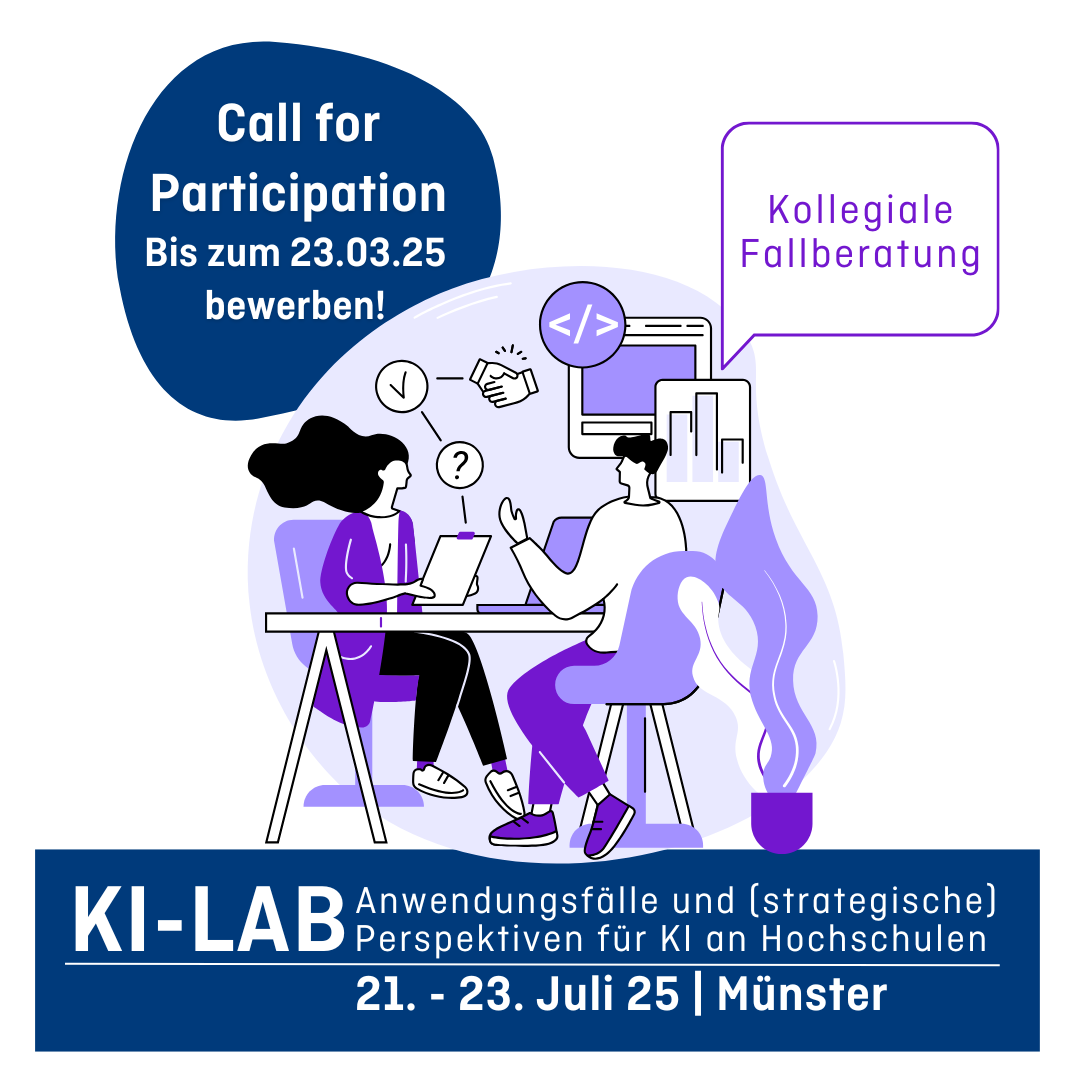 Dekoratives Bild mit dem Text: Call for applications. KI-Lab. Anwendungsfälle und (strategische) Perspektiven für KI an Hochschulen. 24. – 26. August 2026 im Großraum Göttingen.