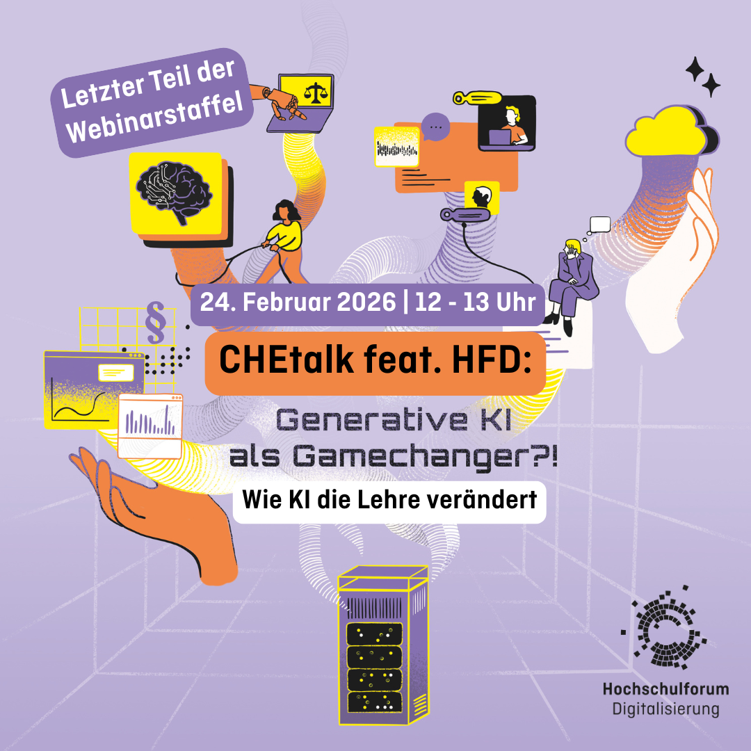 KI verändert nicht nur, was gelehrt wird, sondern auch, wie die Lehre gestaltet ist. Lehrende übernehmen zunehmend Rollen als Lernbegleiter:innen, Kurator:innen und Vermittler:innen von KI-Kompetenzen. Auch für Studierende verändert sich vieles – oft verbunden mit Unsicherheiten im Umgang mit KI. Im Abschlusswebinar der Reihe „CHEtalk feat. Hochschulforum Digitalisierung“ diskutieren Lehrende und Studierende, wie sich Selbstverständnis, Zusammenarbeit und Partizipation im Lehralltag wandeln und welche Chancen und Herausforderungen daraus entstehen.