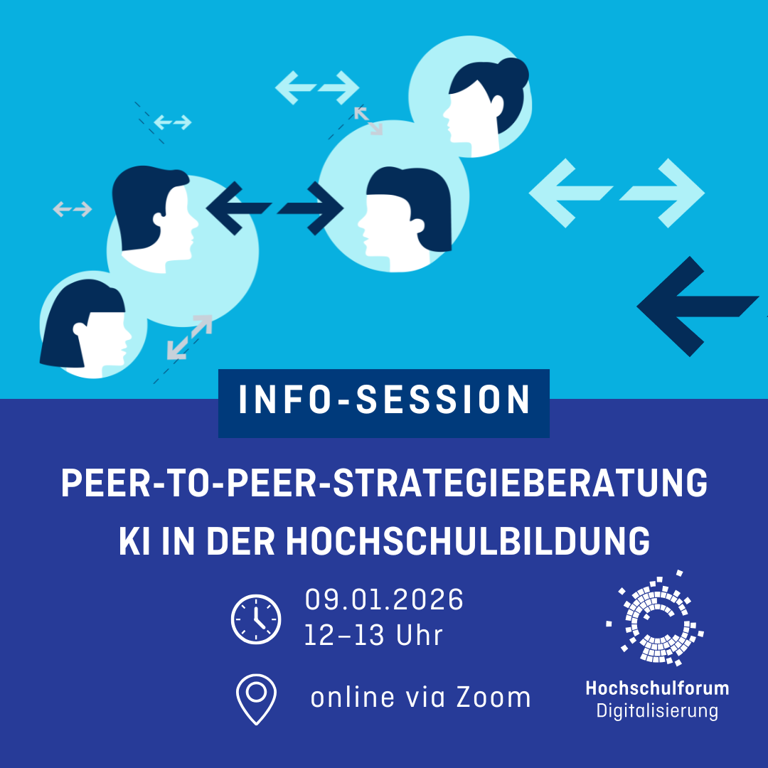 In dieser digitalen Info-Session können Sie sich über die „Peer-to-Peer-Strategieberatung: KI in der Hochschulbildung“ informieren und Ihre Fragen stellen. Wir freuen uns auf Sie! Eine vorherige Anmeldung ist nicht erforderlich.