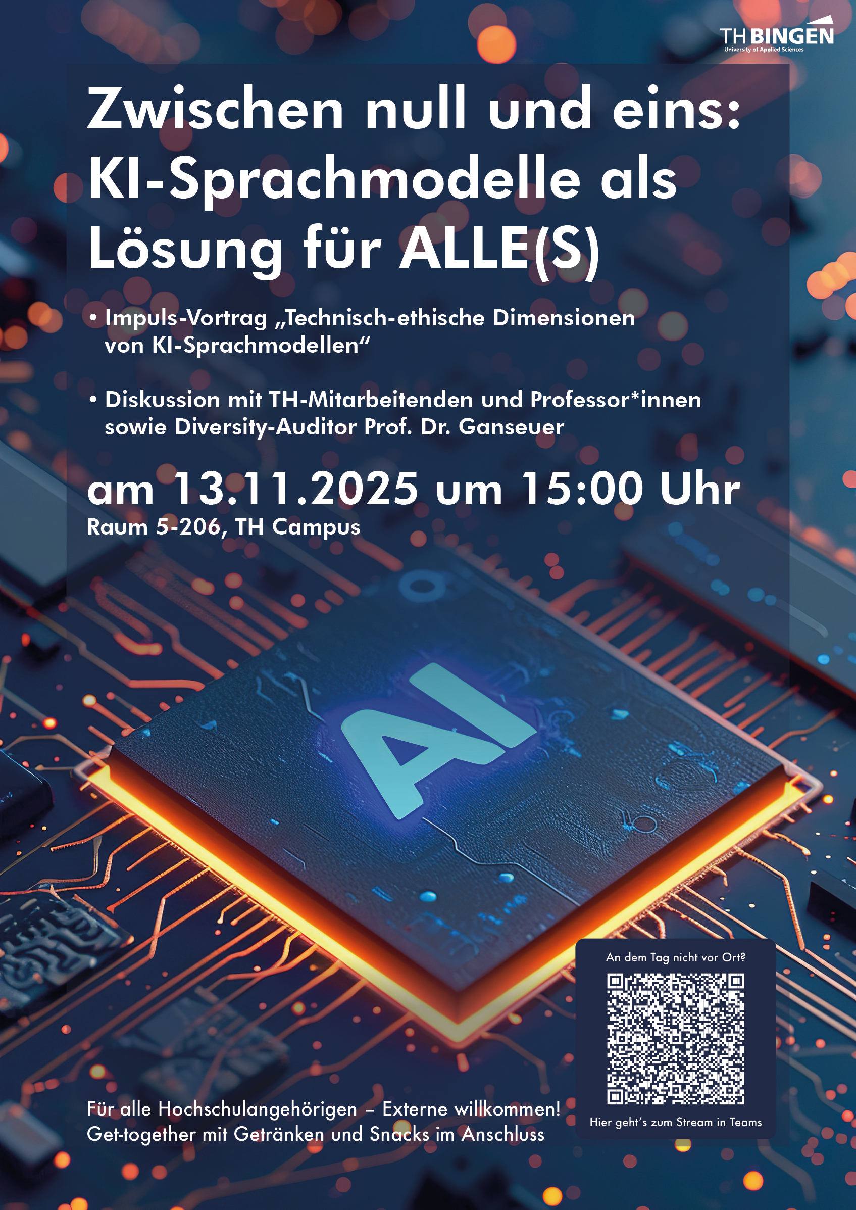 Die Themen KI und Diversity haben auf den ersten Blick wenig gemeinsam. Schaut man genauer hin, werfen beide Themen ähnliche gesellschaftsrelevante Fragestellung wie Teilhabe, Gerechtigkeit und Transparenz auf. KI-Sprachmodelle prägen Studium, Arbeit und Alltag. Der Nachmittag an der TH Bingen beleuchtet, wo Chancen liegen und wo blinde Flecken entstehen, wenn Systeme zwischen „null und eins“ Entscheidungen vorbereiten oder Sprache erzeugen.